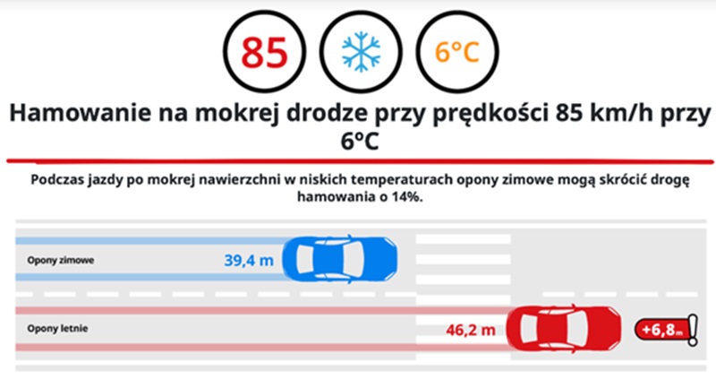Porządna opona zimowa – nawet temperaturze dodatniej – na mokrej drodze ma przyczepność dużo lepszą niż opona letnia. Pokazuje to test robiony przez TUV SÜD na mokrej drodze.Różnica w drodze hamowanie to 7 metrów na korzyść opon zimowych. To są prawie 2 długości małego SUVa!